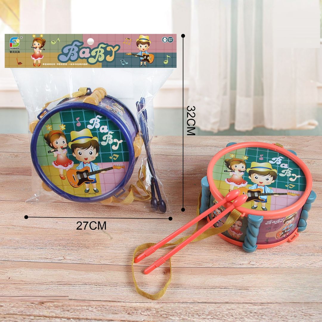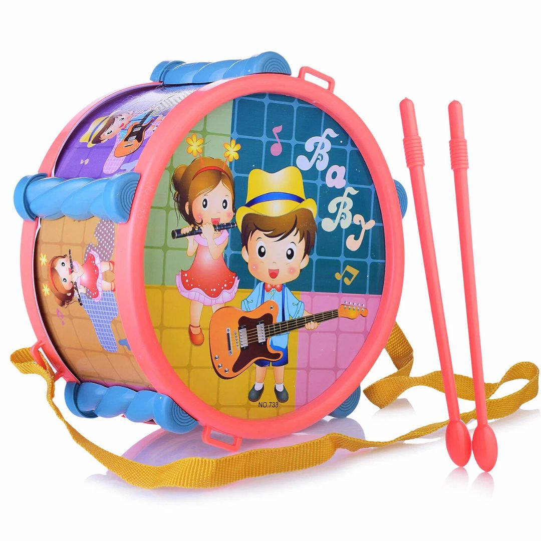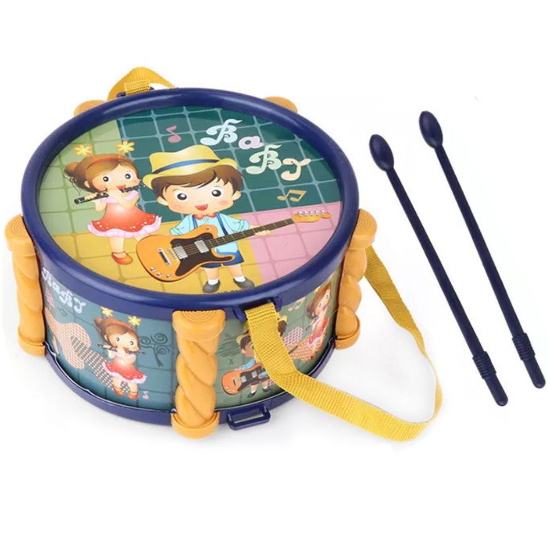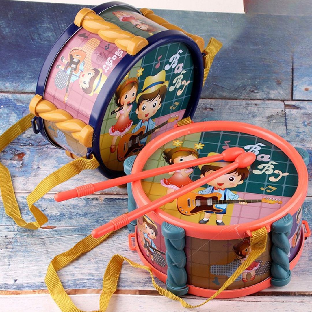 Copilul lovește suprafața tobei cu bețele, ascultă sunetul și intră rapid într-un joc activ care dezvoltă coordonarea mână-ochi, simțul ritmului și încrederea în sine.