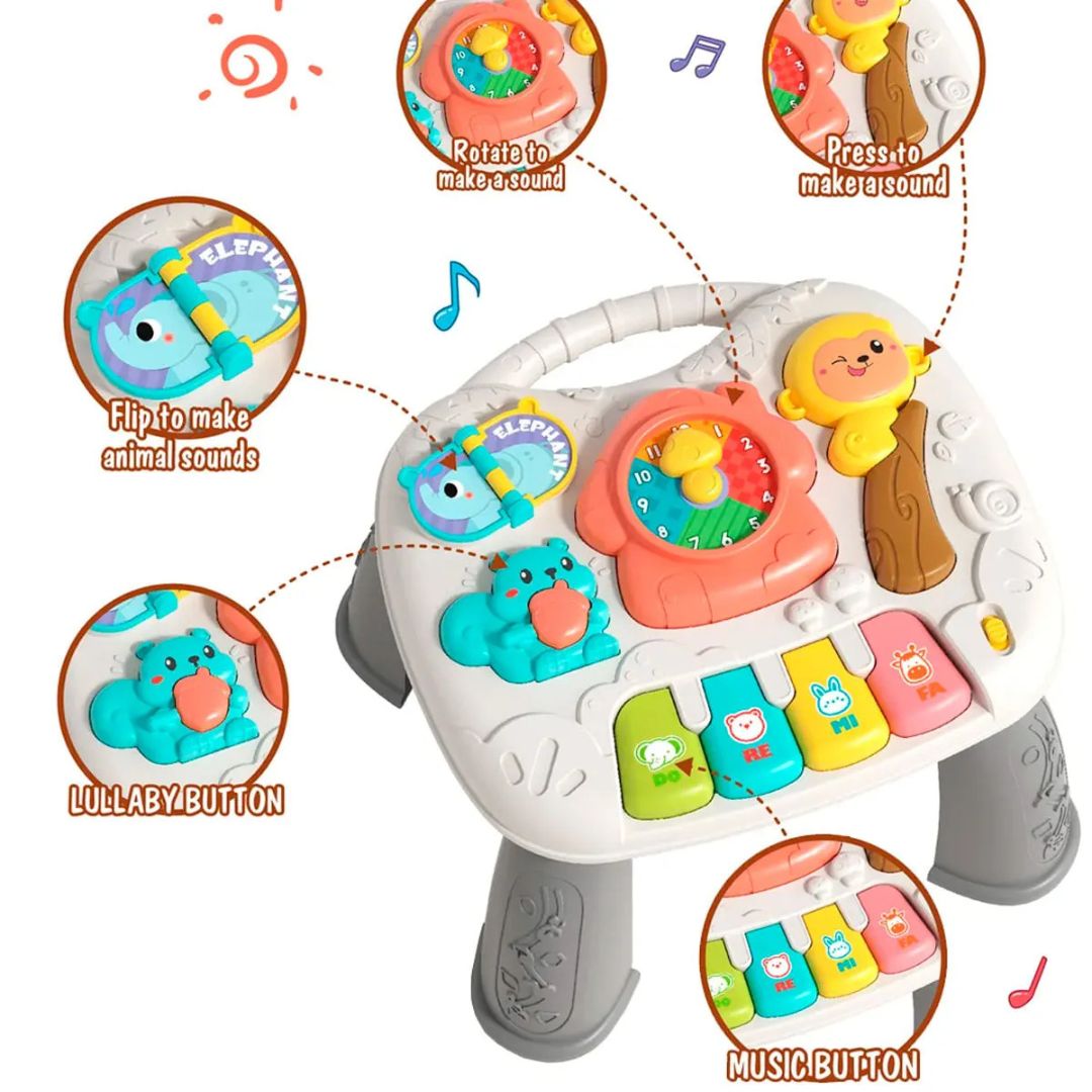 Cu clape tip pian, butoane interactive, elemente care se apasă, se rotesc și scot sunete, această jucărie educativă dezvoltă coordonarea mână-ochi, motricitatea fină și curiozitatea copilului prin joacă practică.